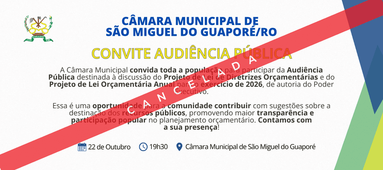 A Câmara Municipal de São Miguel do Guaporé informa que a Audiência Pública, que seria realizada no dia 22 de outubro, às 19h30, para discussão do Projeto de Lei de Diretrizes Orçamentárias (LDO) e do Projeto de Lei Orçamentária Anual (LOA) para o exercício de 2026, foi cancelada. O cancelamento se deve a motivos administrativos, […]